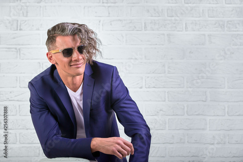 stylish businessman with curly long hair in sunglasses sitting on chair on white background
