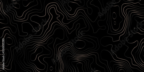 Stylish Dark Terrain Mapping Wavy Line Contour Background. Flowing Contour Lines on Black Modern Topo Aesthetic