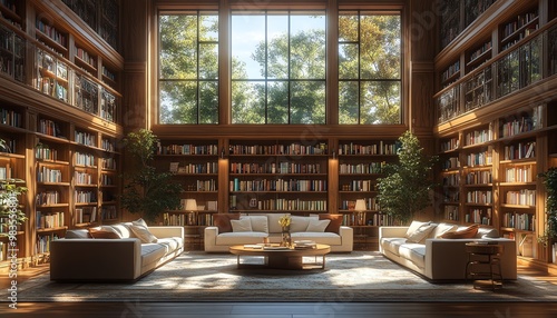 Stylish depiction of a serene library with comfortable seating, large bookshelves, and modern design elements, clean and inviting atmosphere