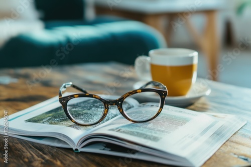 Stylish eyeglasses mockup on an open book cozy home environment lifestyle content inviting viewpoint relaxation concept for seo impact