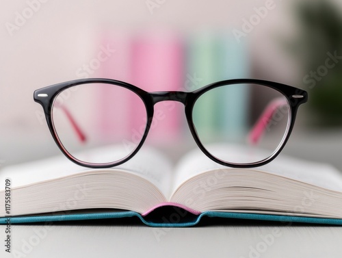 Stylish Eyeglasses Positioned on an Open Book with a Soft Background, Perfect for Literary and Fashion-Themed Inspirations