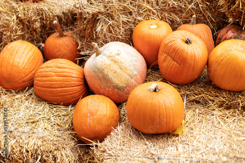 Stylish fall decor of exterior building. Orange halloween pumpkins on stack of hay or straw in sunny day. Rustic Fall Pumpkins and straw Background. Autumn festival. Halloween decoration at home.