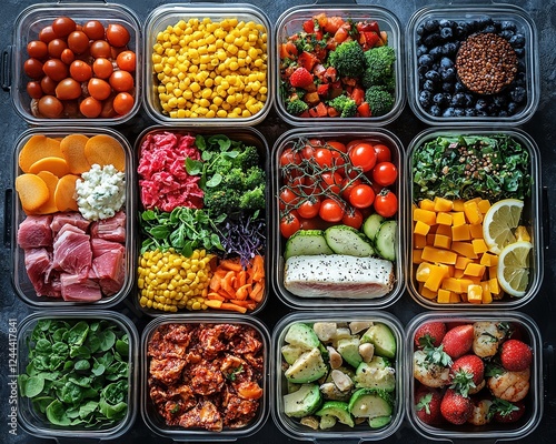Stylish Flat-Lay of Meal Prep Containers with Colorful, Nutritious Meals for a Health Plan