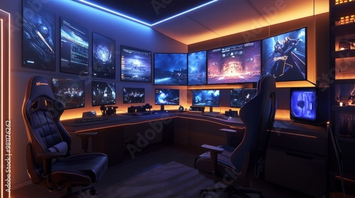 Stylish gaming room featuring a sleek desk setup with multiple screens, customizable LED lighting, and ergonomic seating.