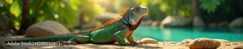 Stylish iguana sunbathing, colorful tropical paradise, reptile portrait, animal portrait, reptile