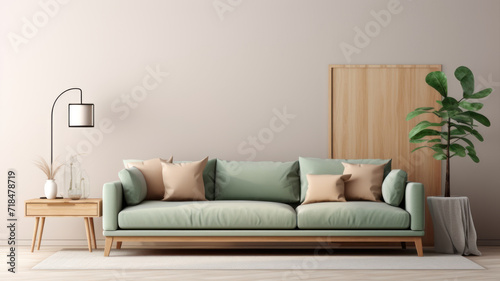 Stylish interior design living room modern mint sofa wooden consol, cube, coffee table lamp