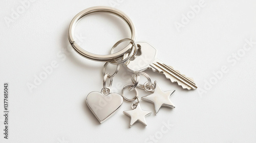 Stylish keychain with metallic charm and keys against a minimalistic background.