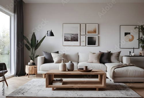 Stylish living room boasting a cozy sofa setup with neutral tones, tasteful wall art, and natural light from large windows
