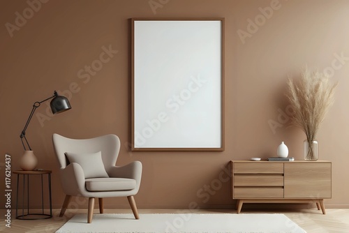 Stylish living room interior design with mock up poster frame, frotte armchair, wooden commode, side table on pantone mocha mousse background with copy space