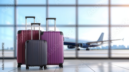 Stylish luggage in an airport terminal, ready for travel with a modern airplane in the background, perfect for travel-themed projects.