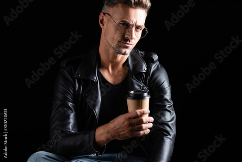 Stylish man in biker jacket looking at camera while holding disposable cup isolated on black