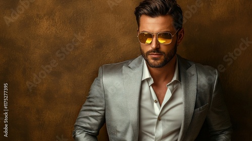 Stylish man wearing sunglasses and a suit against a textured background