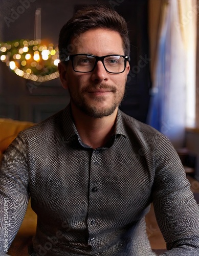 Stylish Man With Glasses and Beard Relaxing Indoors in Warm, Inviting Atmosphere