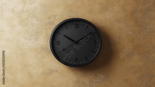 Stylish minimalistic clock with striking black hands and a smooth black surface devoid of numerals elegantly displayed on a warm beige background to accentuate its minimalist charm
