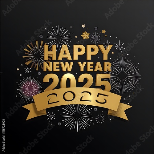 Stylish New Year’s 2025 Greeting Design with Gold Text, Ribbon Banner, and Festive Fireworks on Black Background