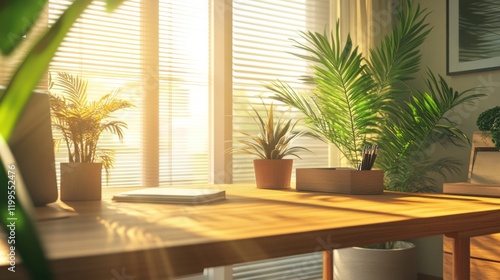 Stylish office background with a clean wooden desk, potted plants, and large sunlit windows