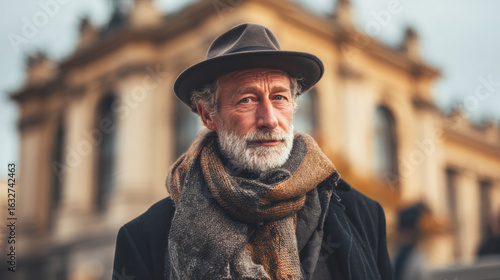 Stylish older man in a hat and scarf, standing confidently in autumn city background