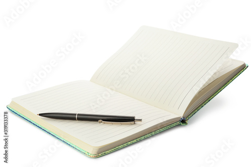 Stylish open notebook and pen isolated on white