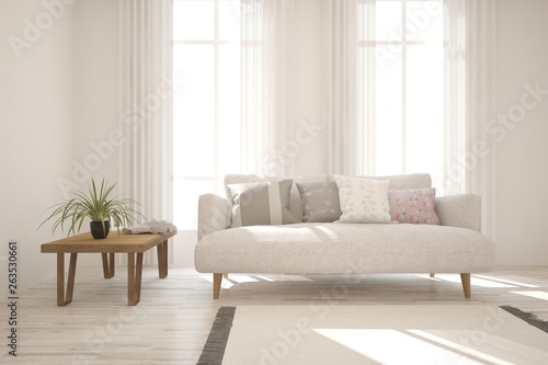 Stylish room in white color with sofa. Scandinavian interior design. 3D illustration