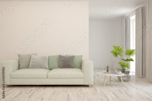 Stylish room in white color with sofa. Scandinavian interior design. 3D illustration