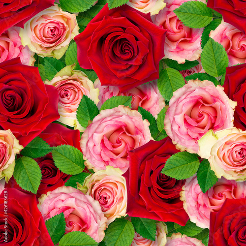 Stylish seamless pattern of red and tea rose flowers. Bright colorful summer background.