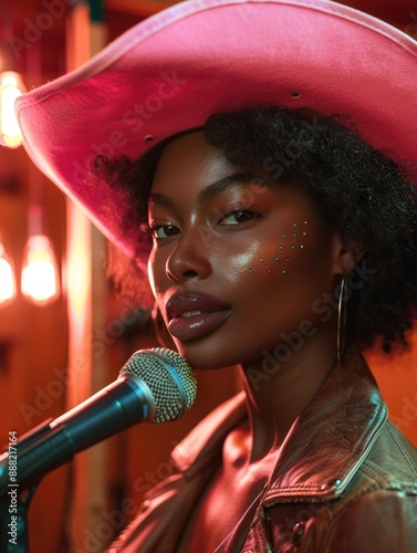 Stylish Singer with Pink Hat Performing in Red Neon Light