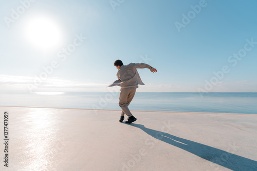 Stylish urban dancer moving by the seaside