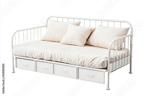 Stylish white daybed with soft cushions and storage drawers, perfect for versatile living spaces.