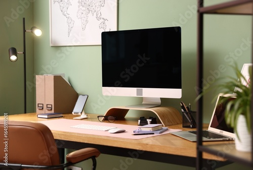 Stylish workplace with modern computer, other devices and stationery on wooden desk indoors