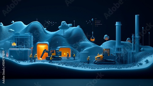 Stylized 3D illustration of an industrial mining scene with machinery and workers.