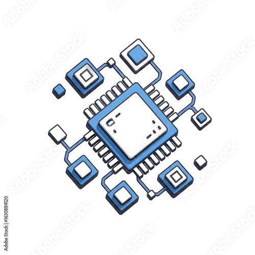 Stylized 3D isometric illustration of a blue and white computer processor microchip with bold outlines. PNG Transparent Background