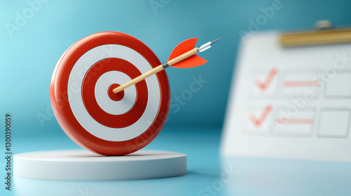 stylized 3D target with red and white rings is hit by arrow, symbolizing precision and success, with checklist in background