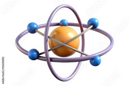 Stylized atomic model with orange nucleus and blue electrons orbiting