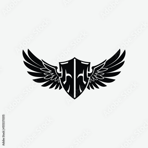 Stylized black and white logo with shield and symmetrical wings. A modern, bold emblem symbolizing strength, protection, and freedom with a clean, striking design.
