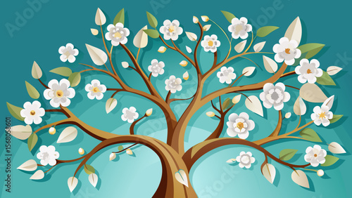 Stylized blooming tree with white flowers and green leaves against a gradient teal background