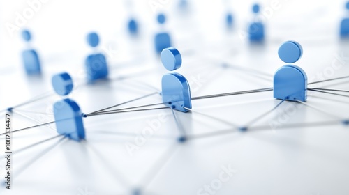 Stylized blue figures symbolize people interacting in a digital network. The design illustrates connectivity and relationship development in a modern context