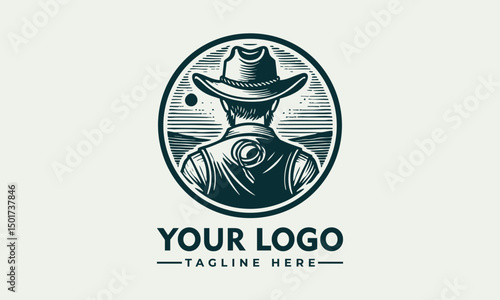Stylized cowboy figure wearing hat and vest inside circular badge with confident western character pose. People concept