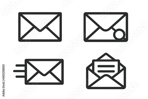 Stylized Envelope Icons Collection – Vector Line Art Illustrations Showing Classic Mail, New Message Notification, Sent Email, and Inbox Letter Concepts on Transparent Background