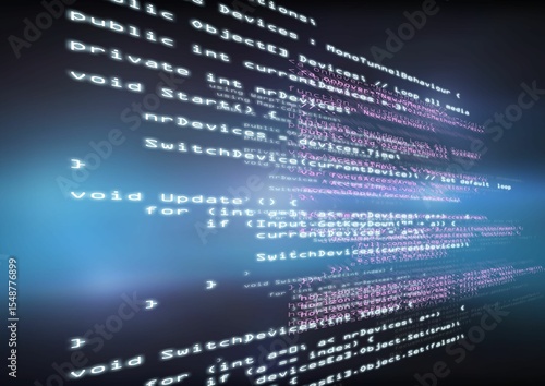 Stylized glowing 3D code lines are floating across blurred blue purple gradient backdrop