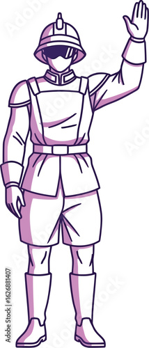 Stylized illustration of a uniformed character in a helmet and shorts with one arm raised in a greeting or stop gesture rendered in a purple and white color scheme