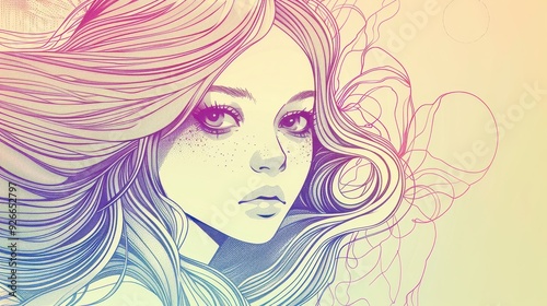 Stylized illustration of a woman's face with flowing hair, featuring artistic elements like floral patterns