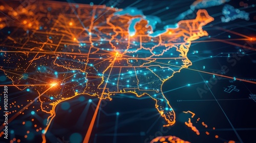 Stylized map of the United States with glowing lines and points indicating connections and networks. Modern technology and communication concept.