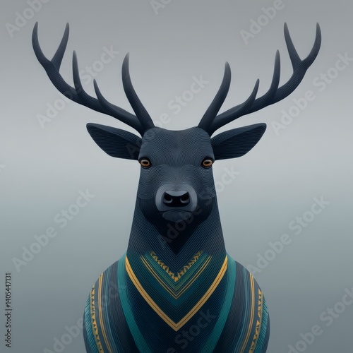 Stylized modern buck in geometric sweater pattern blending anthropomorphic concept and symmetrical digital character on cool blue background