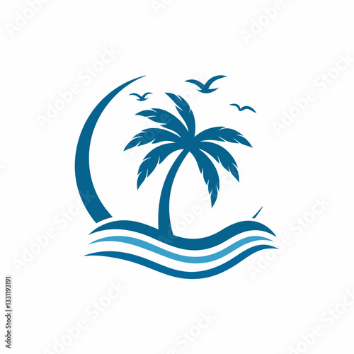 Stylized Ocean Wave and Palm Tree vector Logo.