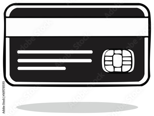 Stylized plastic card graphic with a chip, stripe and shadow offering a symbolic representation of modern payment methods.