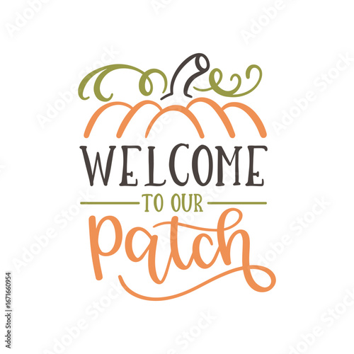 Stylized pumpkin graphic: "WELCOME TO OUR patch" text, orange pumpkin shape, green vines, dark stem, cheerful, inviting, flat design, light background.