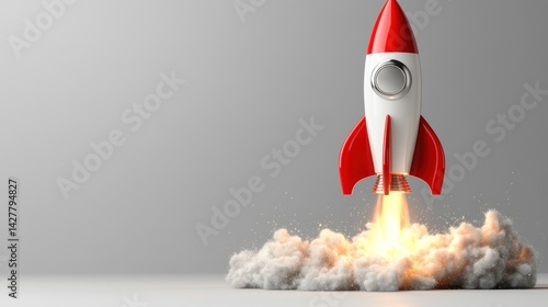 stylized rocket launching with exhaust flames emitting into smoke cloud against gray background depicting innovation and aspiration