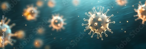 Stylized scientific visualization of viruses and bacteria flying through the air in a minimalist aesthetic