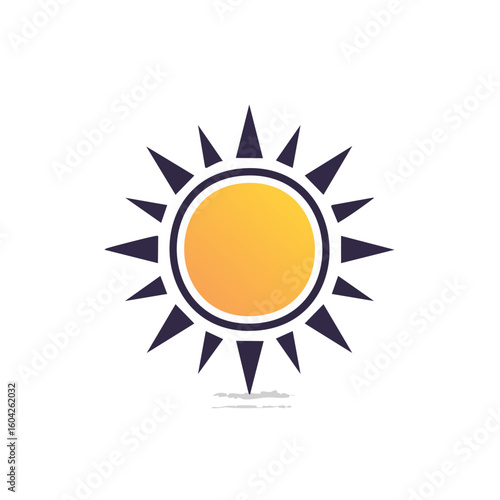 Stylized sun graphic on black background. Yellow gradient circle with spikes. Abstract warm weather sunshine rays and brush stroke effect