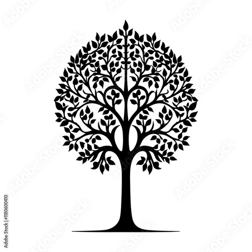 Stylized Tree Silhouette, Round Shape.Abstract Tree Vector, Black and White.Tree of Life Symbol, Minimalist Art.Black Tree Silhouette, White Background.Tree Icon, Decorative Design Element
